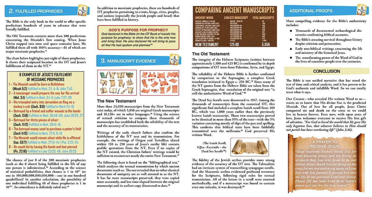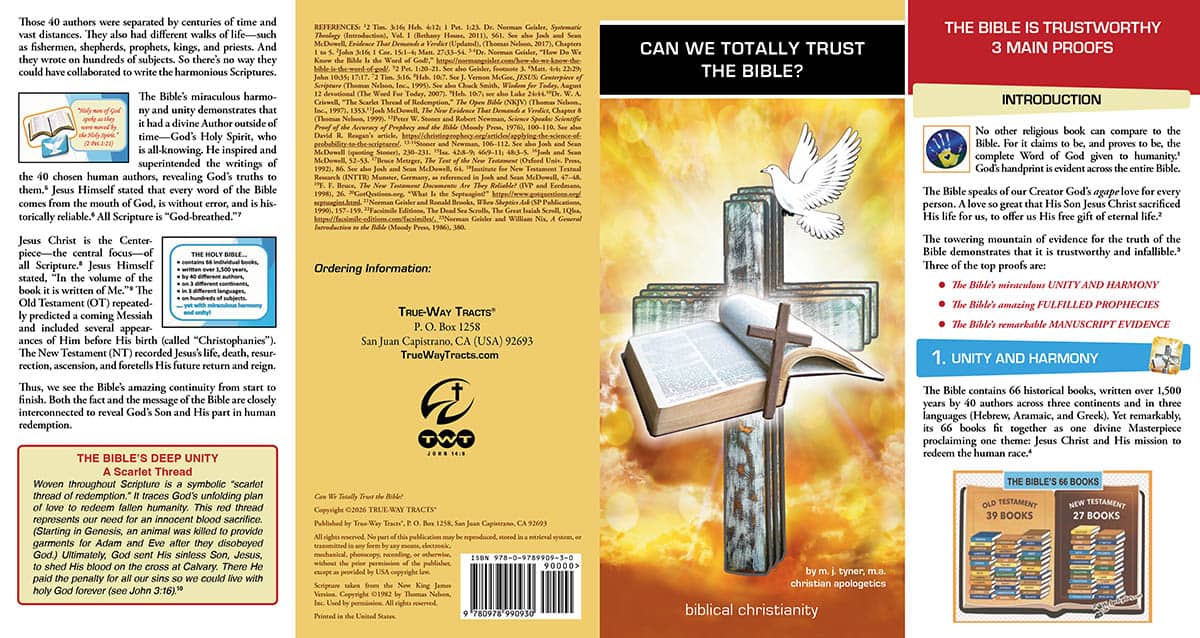 Many people wonder whether the Bible is reliable and trustworthy. This pocket-sized apologetics tract tackles that fundamental topic by presenting three powerful proofs: the Bible’s miraculous unity and harmony, fulfilled prophecies, and manuscript evidence. It also presents the Christian gospel and a suggested salvation prayer. Share these pamphlets with unbelievers and new believers so more valuable souls will read the Bible and learn about Jesus Christ, His mission to redeem the human race, and how to personally relate to Him now and forever.